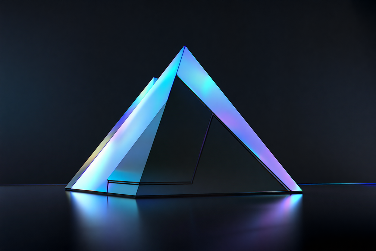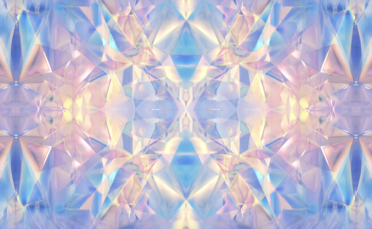 A digital abstract artwork with a symmetrical, kaleidoscope pattern featuring pastel colors like pink, blue, purple, and yellow, resembling a crystalline structure or faceted gemstone.