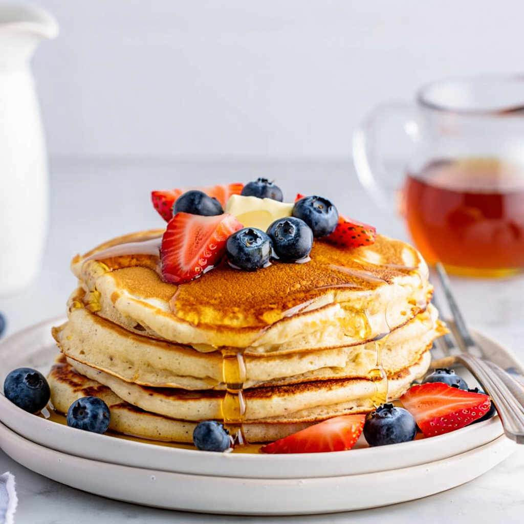 Stack of three pancakes topped with strawberries, blueberries, a pat of butter, and syrup, with additional berries and syrup in the background.